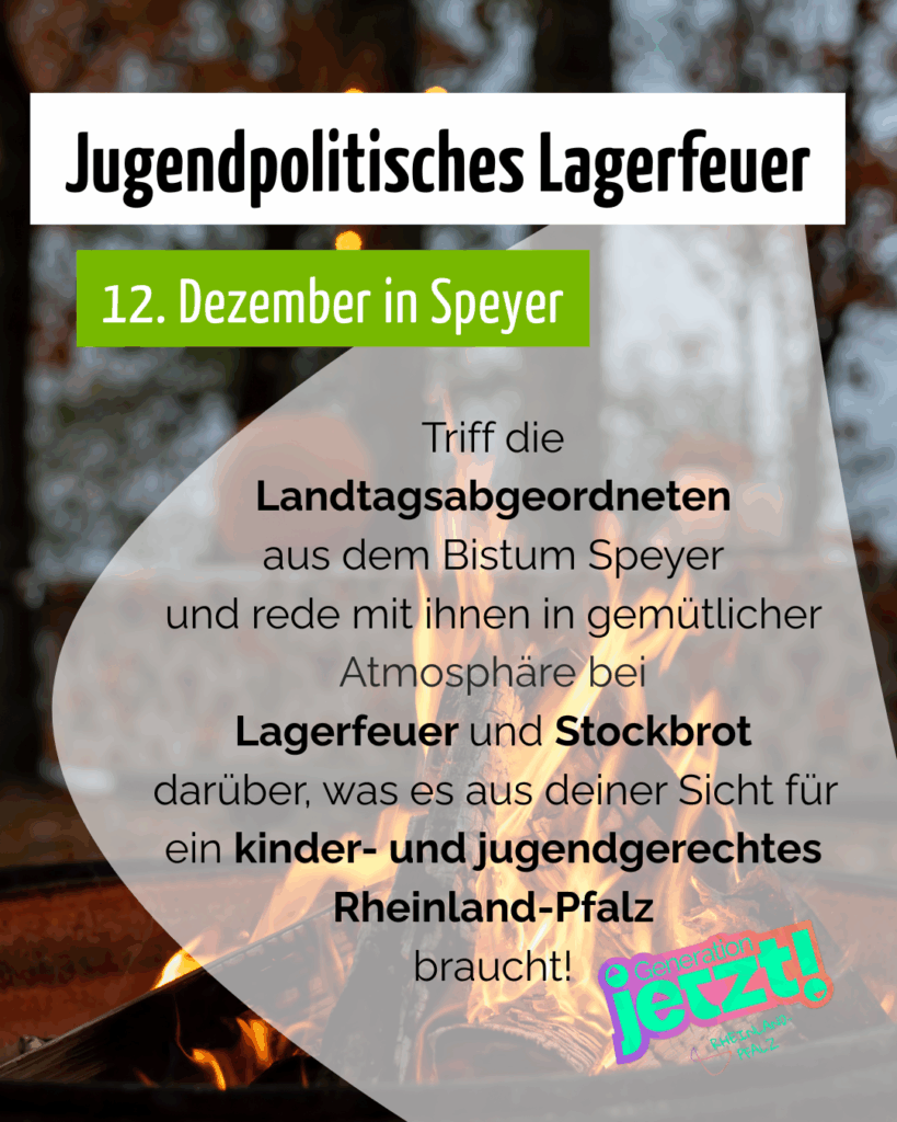 (Speyer, 19.11.2025) Der Bund der Deutschen Katholischen Jugend (BDKJ) Diözesanverband Speyer lädt herzlich zu seinem jugendpolitischen Lagerfeuer ein, bei dem junge Menschen gemeinsam mit Abgeordneten des Landtags Rheinland‑Pfalz in lockerer Atmosphäre ins Gespräch kommen können.